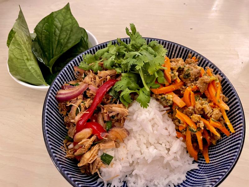 hier gab es heute zwei panasiatische fleischsalate, einen mit aus dem tk geborgenen, angebratenen und dabei mit ingwer, zitronengras, reissirup, sojasauce und schwarzem essig gewürztem suppenhuhnfleisch (dazu paprika, rote zwiebel, frühlingszwiebel, schnittknoblauch) und einen mit schweinehackfleisch mit ingwer und khao khua (dazu karotten und minze). beide leicht chilischarf und mit viel frischem limettensaft. für mich kamen noch ein paar pfefferblätter und mit gartenchiliabschnitten gewürzte fischsauce dazu.