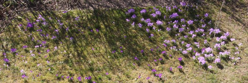 Hier, die hintere Gruppe, einer der Sämlinge, die vielfach im Rasen unter den Elfen auftauchen, etwas später als diese blühen und wenig früher als die ebenfalls in der Nähe wachsenden, hierher versamten C. vernus.