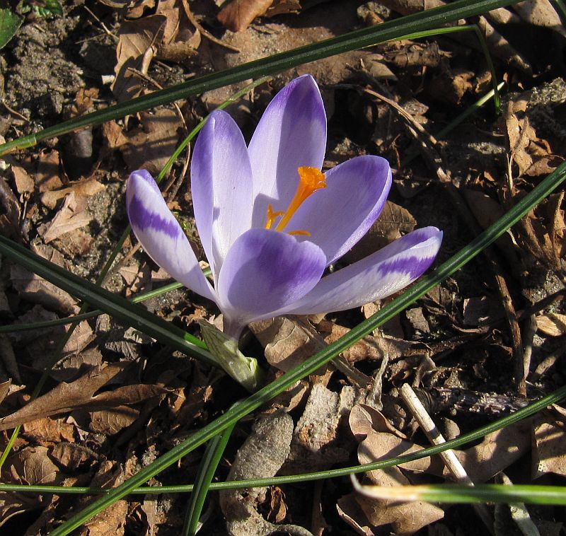 Ein einsamer Crocus chrysanthus in einer Ecke des Gartens, in der ich keine Erinnerung habe, dass ich die Sorte je gesteckt hätte. Sieht 'Blue Pearl' ähnlich.