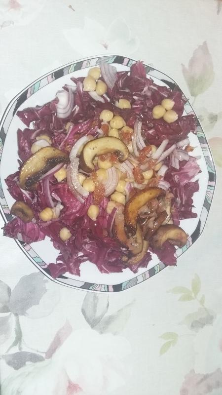 Ich habe für zwei Essen Kichererbsen eingeweicht und gekocht. Es gab gestern Salat: Raddicchio, rote Zwiebel, Kichererbsen, gebratene Champignons und knusprig gebratener Pancetta.