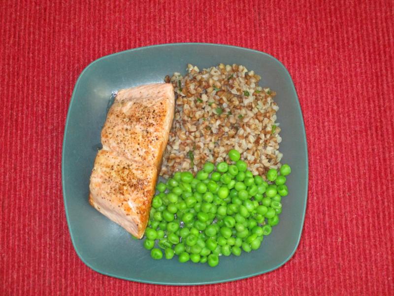 pfeffriges Lachsfilet mit grünen Erbsen und Petersilienbuchweizen
