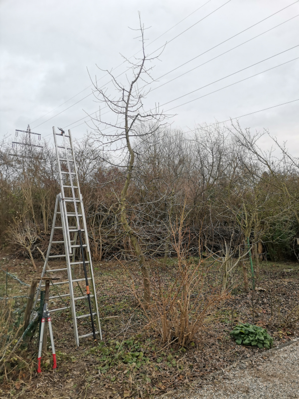 Auch beim gut erzogenen Hochstamm auf MM106 muss man unten die Sekundäräste oder Tertiäräste der Leitäste kürzen, um sich untendrunter durchbücken zu können.