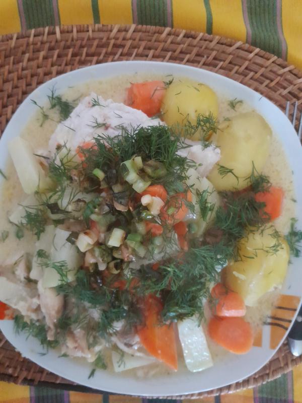 Frühlingsgemüse (Kohlrabi, Karotten, Erbsen) in einer buttrigsahnigen Sauce, kurz angebratener Fisch (Rest Kabeljau, Rest Seeteufel, Rotbarsch) obendrauf duchziehen lassen. Frischer Dill und kurz angebratene Frühlingszwiebeln als Topping. Dazu Pellkartoffeln