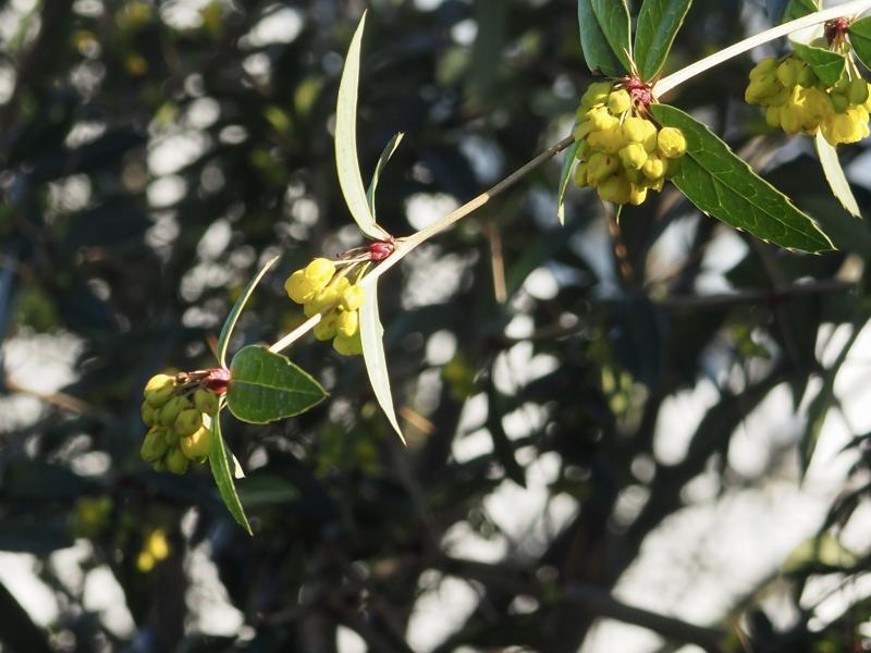 was ist das... groß, sehr lange Dornen, immergrünes Laub mit einer Unmenge gelber Blüten und überhängenden Zweigen. Wächst am hinteren Ende des Gartens... wahrscheinlich schon seit Jahrzehnten... ein quasi undurchdringliches Gestrüpp... stachelig aber dekorativ. Ich finde bei meiner Internetrecherche Juljianenberberitze... Aber die Blütezeit wird mit Mai bis Juni angegeben... und das hier blüht jetzt. Ein Detailbild
