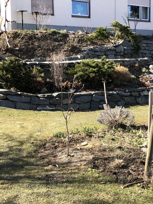 Heute haben wir die Anlage eines weiteren Staudenbeetes begonnen, zentral einen Zierapfel Red Sentinel gepflanzt, das Beet links wird ergänzt und verändert: