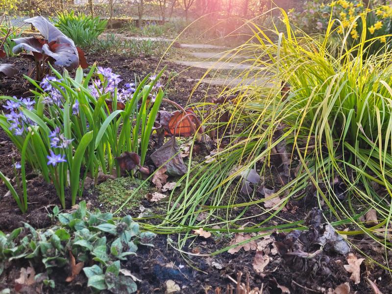 Hier mal wieder ein Blick in den Vorgarten. Zwischen den 2 Höhepunkten - Schneeglöckchen- und Tulpenblüte - überbrücken die Primeln, ein paar Hyazinthen und Narcissus 'Minnow'. Mit anderen Worten: etwas Kleinkram ;)