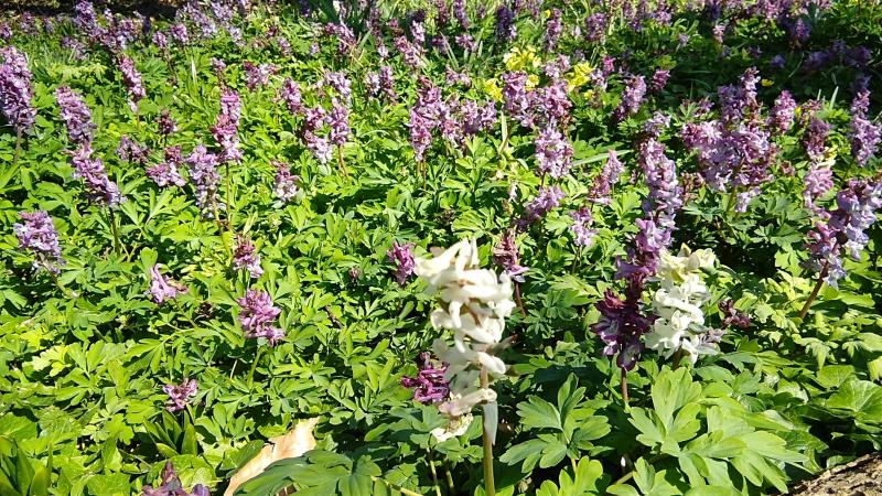 Corydalis, violett und weiß kommt überall in den "wilden Bereichen" wo sie nicht gestört werden vom Rasentraktor in Massen vor.
