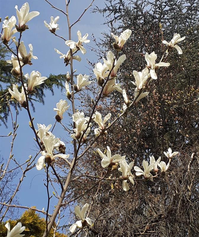 In meiner Region treiben jetzt die Blätter der M. Soulangeanas, die Sternmagnolien sind in Vollblüte und meine Neugepflanzen in halbschattiger Lage sind noch fest geschlossen.