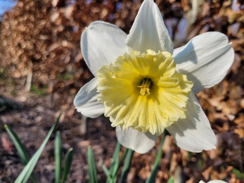 An meinem Arbeitsort ist heute morgen zum ersten Mal diese Wahnsinnsnarzisse aufgegangen und hat uns alle überrascht. Ob es am Saharastaub liegt, an Sonneneruptionen oder diesen unleidigen Mondknoten, wissen wir nicht. Sie ist einmalig, wir werden versuchen, sie zu vermehren und dereinst als 'Schöne von Brüglingen', 'Merians Vermächtnis', 'Gärtner:innenwahnsinn' oder 'Poisson d'Avril' zu vermarkten. Verhandlungen mit der Niederländischen Zwiebelbranche laufen schon. Unseres Wissens gibt es bisher noch keine vergleichbare Narzisse. Stehende Ovulationen seien ihr gewiss!