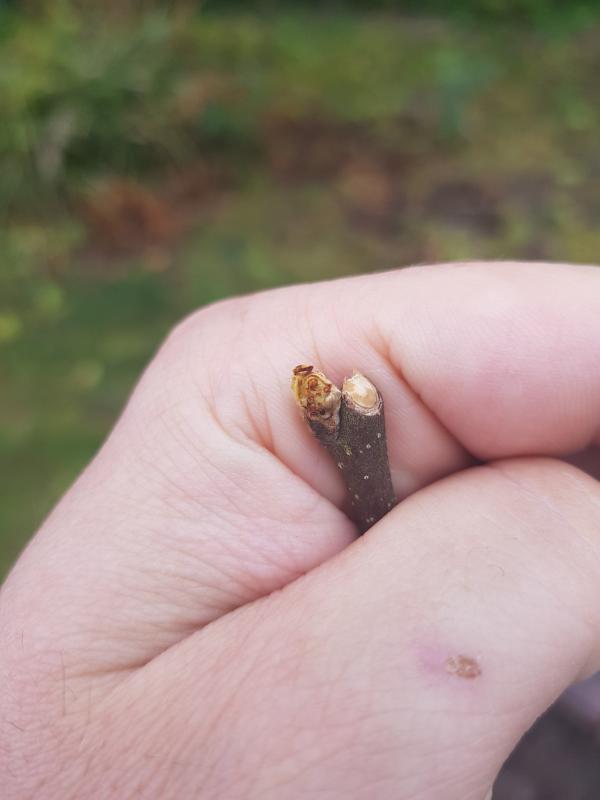 An einem meiner Apfelbäume sind 3 Endknospen(3 von 4 Leitäste) bräunlich. Eine wirkt wie zur Hälfte angefressen.