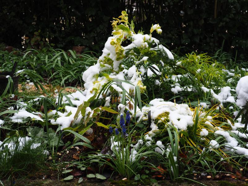 das eine Muscari hat eine weiße Haube. Sieht man nicht, der Hintergrund ist auch weiß, nochmal raus und weg ist die Schneehaube auf dem Muscari. Dumm gelaufen.
