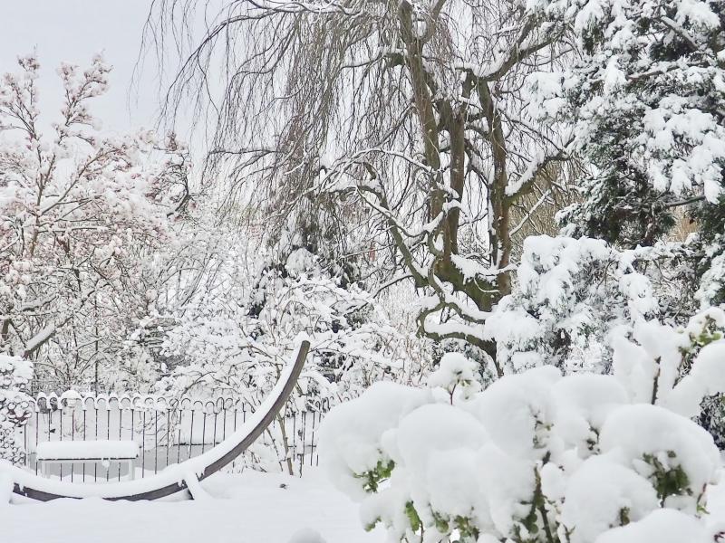 So sah es heute in den frühen Morgenstunden in unserem Garten aus... alles wunderbar eingepackt in eine dicke Schneedecke. Jetzt taut gerade alles und heute Nacht soll der Frost kommen.