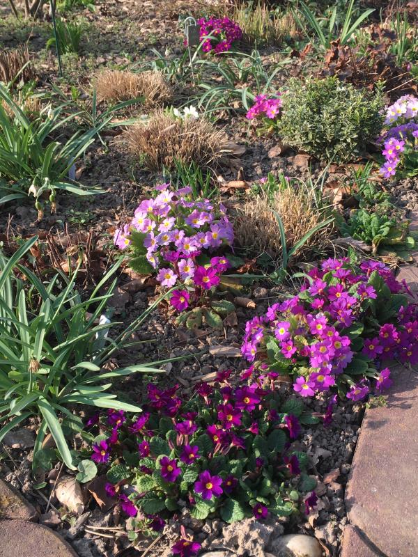 Nur die Primula Poly Cowichan und einige gefüllte Vulgaris päppel ich inzwischen in Töpfen. Wobei ich begeistert bin, dass Primula vulgaris Double 'Captain Blood' in der Pflanzung von roten Päonien immer noch überlebt.