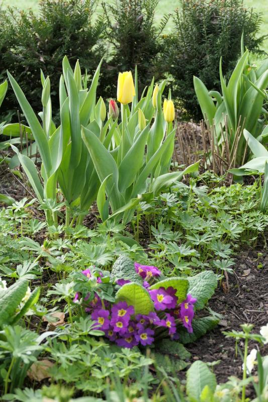Nur die Primula Poly Cowichan und einige gefüllte Vulgaris päppel ich inzwischen in Töpfen. Wobei ich begeistert bin, dass Primula vulgaris Double 'Captain Blood' in der Pflanzung von roten Päonien immer noch überlebt.