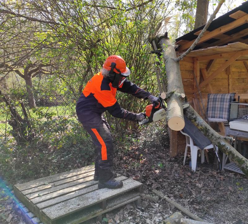 Es war allerdings schon eine Sache die mit Sorgfalt angegangen sein wollte. Lilo ist da sehr geübt und behält den Überblick über die Gewichtsverteilung. Am Schluss haben wir meine stärkste Leiter unter den hängenden Ast geschoben damit der nicht auf den Zaun donnert. Das hat gut geklappt und die letzten Meter sind uns dann passgenau vor die Füße gefallen. Ein Fach im Holzlager ist jetzt voll und ein überschaubarer Berg Äste harrt des Hexlers.