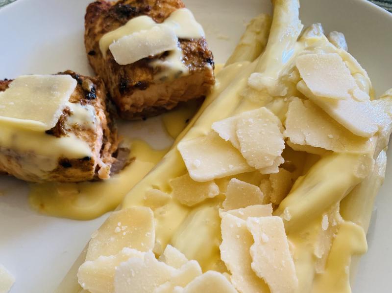 Spargel mit Sauce Hollandaise und Parmesanspäne, dazu Lachs mariniert in Zitronenöl und Dukka-Würzmischung aus dem Airfryer. Kartoffeln waren auch dabei, sieht man aber nicht