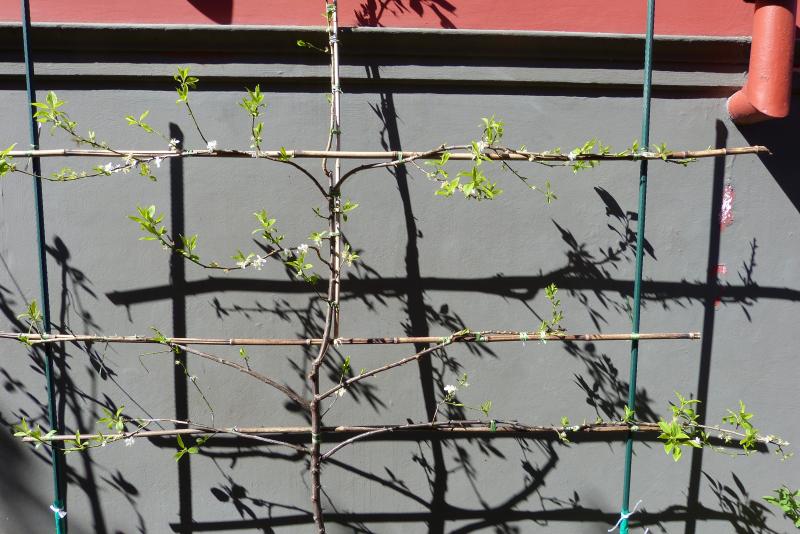 @Pruimenpit: Das Bild von Flora1957s Zwetsche zeigt sehr schön, den positiven Einfluss des Waagerechtbindens auf die Bildung von Blüten. Ein weiterer günstiger Effekt kommt von der schwachwüchsigen Unterlage.