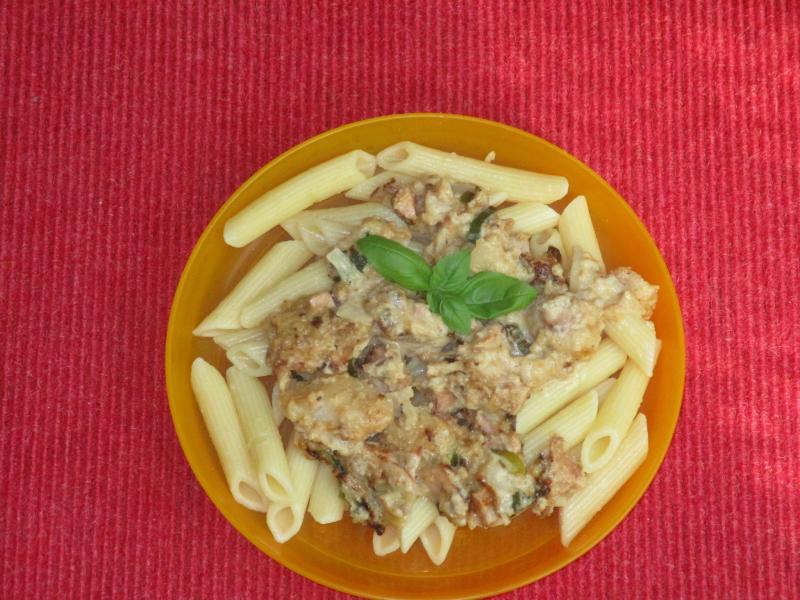 Resteverwertung: Nudeln mit Soße aus Blumenkohl, gegrilltem Schwein, Lauch-Käse-Suppe
