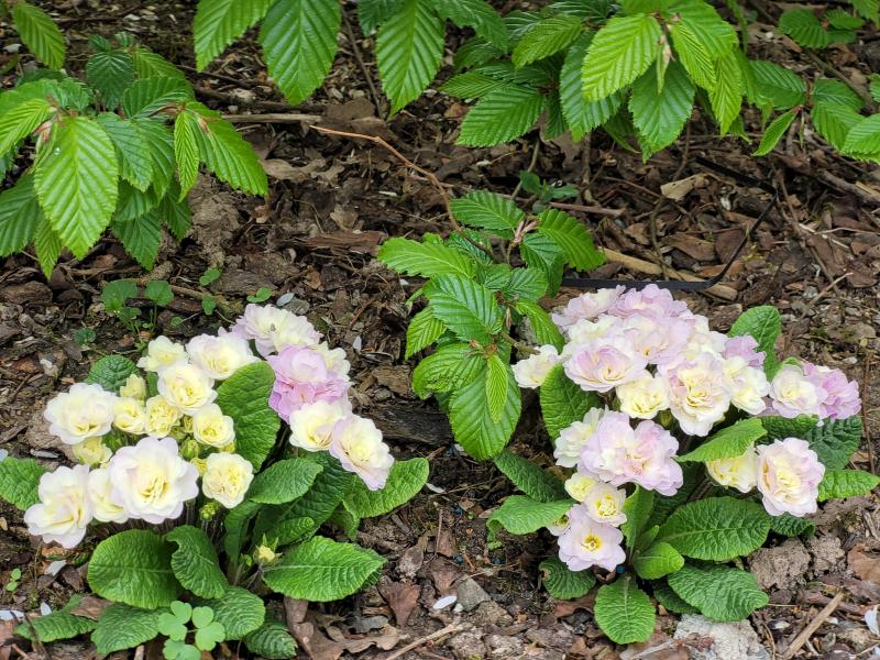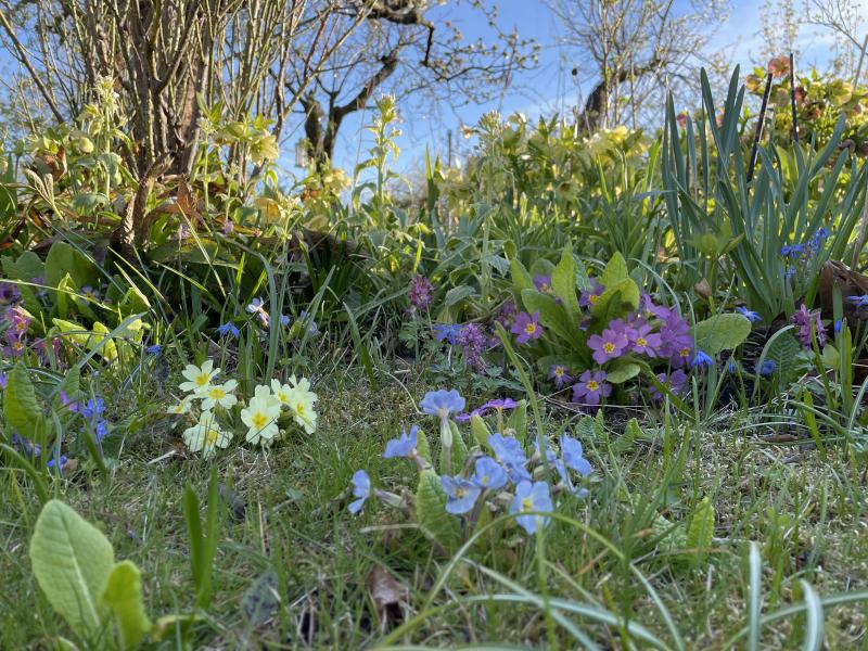 was mich gerade sehr freut, sind die derzeit überwiegend nach den frühen kissenprimeln im "rasen" erblühenden himmelblauen barnhaven-primeln, die ich letztes jahr als plugplants dahin setzte – das ist eine sehr erfreuliche ablösung. :)