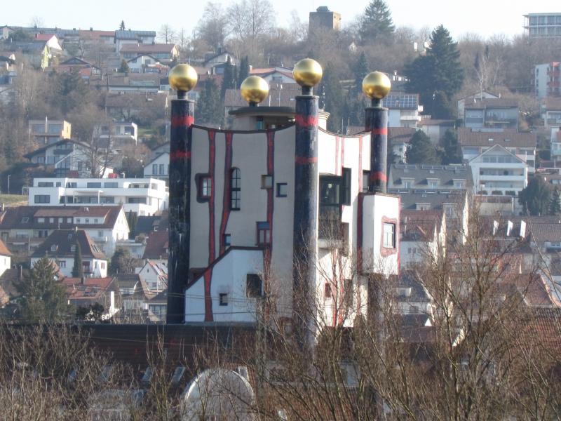 In Plochingen, wo das Hundertwasserhaus steht, bin ich zwar nicht zuhause. Aber auch nicht übermäßig weit davon entfernt. Außerdem ist es ganz sicher eines der auffälligsten Gebäude Im Neckartal, heute musste ich mal nicht im Auto auf der B10 dran vorbeirauschen.