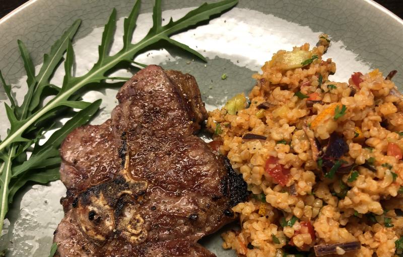 Und eben Lammkoteletts mit Bulgur. Der Bulgur wurde mit Hühnerbrühe gegart und mit, Harissa, Tomate, Gurke, viel frischem Koriander, roten Zwiebeln, Frühlingszwiebeln, Kumquats, Zitonensaft, Salz und Pfeffer abgeschmeckt. Das war echt :) lecker!