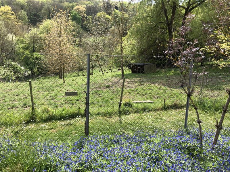 Hier ein Blick (ich weiß, es ist kein tolles Foto) über den Rasenweg unter dem Garten zu den Schafsweiden. Die kleinen braunen Punkte in der oberen Mitte des Bildes sind die Schafe. Da wird mir ganz warm ums Herz, wenn ich sie da unten friedlich grasen sehe. ;)