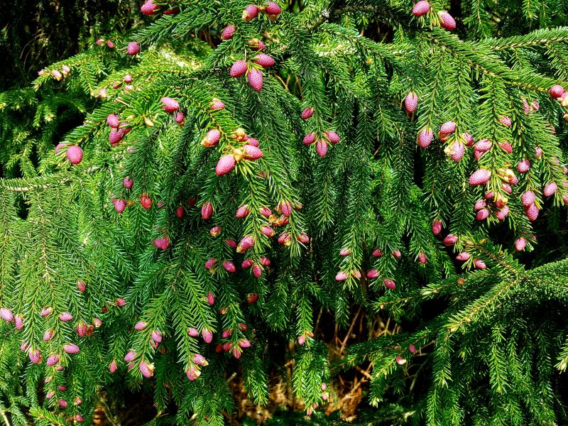 (Weibliche ) Blüte der Orient Fichte, schöner RotGrünkontrast, der Blütenstaub wird demnaechst bei Wind im ganzen Garten verteilt