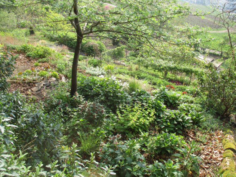 Blick von dem Gartenteil, den ich kleine Macchia nenne, über die Kräutermauer zur Schaukel.