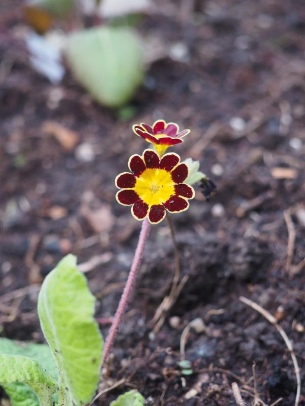 ebenso frisch im Garten sind die primula gold laced beeches. fünf wahre Winzlinge von Barnhaven. Sie machen trotzdem einen robusten Eindruck. Ich hoffe, sie überleben das Jahr und kommen 2023 eindrucksvoller zurück.