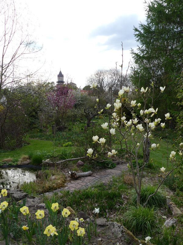 Magnolia 'Genie' hat die Fröste noch knospig gut überstanden und blüht gerade reich.