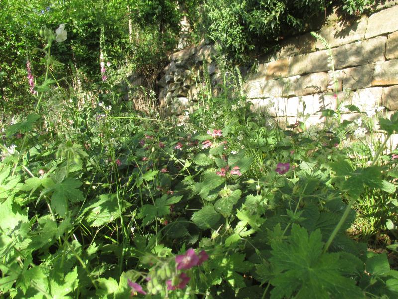 Ins Beet gepflanzt habe ich Helleboren, Acanthus, Geranium aber bestimmend sind heute die selbständigen Kollegen Digitalis rubra, Papaver atlanticum,Iiris tectorum und Saponaria vulgaris.