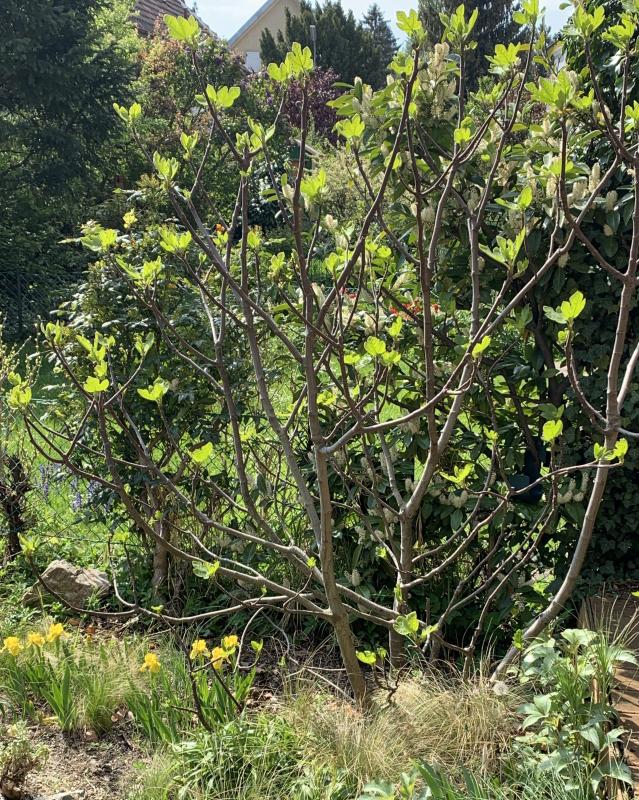 Longue d'Août, ca. 5. Standjahr. SO Seite. Mehr Schäden, exponiertere Lage. Man erkennt noch deutlich den Schaden vom Winter 20/21. Schaden bis fast runter. Herbstfeigen könnten noch was werden. 2019 habe ich im Oktober noch ein paar schöne Exemplare geerntet, obwohl es im Frühjahr den Neuaustrieb gezischt hatte.