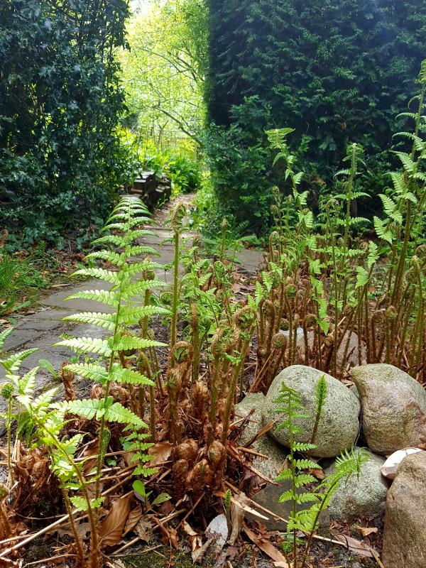 Garteneingangssituation, schattig durch dichte Eibe, im Schatten hauptsaechlich Wurmfarn.