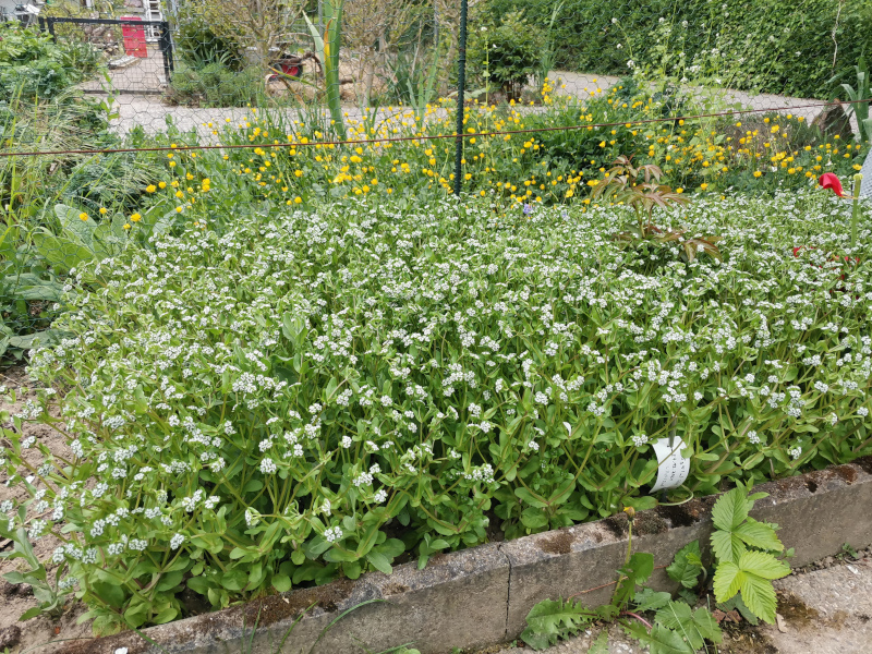 Blütenmeer von Valerianella locusta, der kriechende Hahnenfuß dahinter muss noch gejätet werden, die Knoblauchrauke bleibt aber.