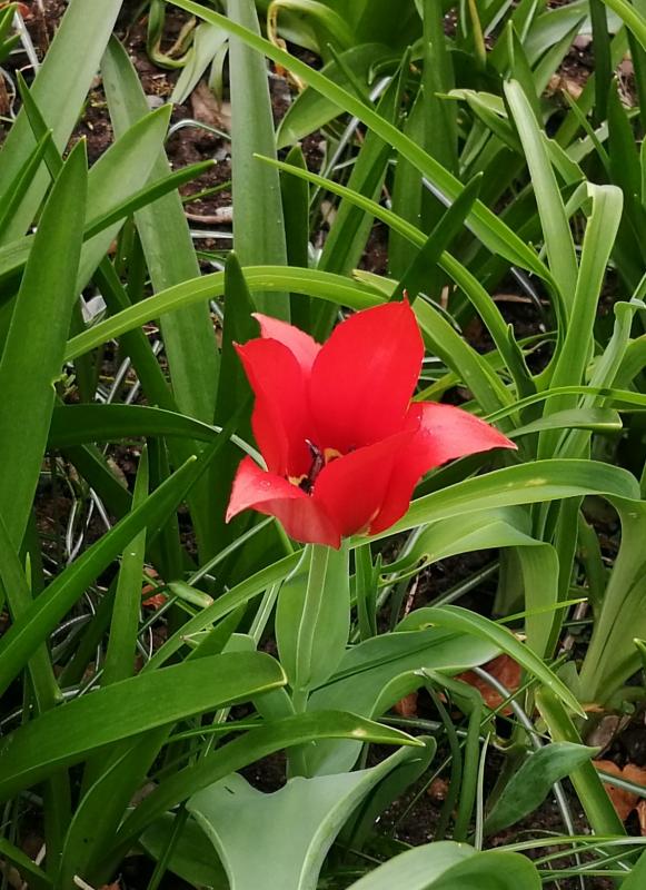 Die wahre 'Lizzy' blüht jetzt. Ob sie wirklich zu den Wildtulpen gehört oder eine echte Züchtung ist, weiß ich nicht. Sie wirkt für mich wie eine feuerrote Auslese von Tulipa hageri, also auch aus dem orphanidea-Aggregat. Auch das ist nur ein Eindruck. Ich weiß nichts über die Herkunft der Sorte.