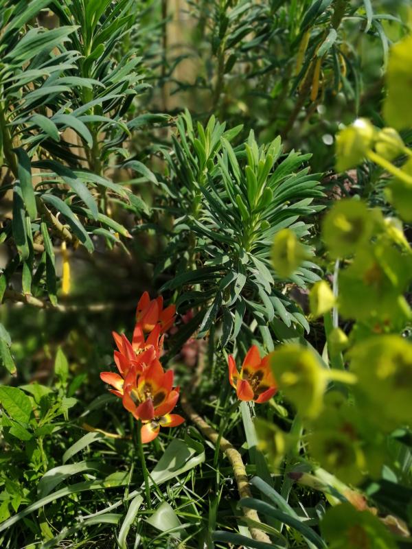 Die wahre 'Lizzy' blüht jetzt. Ob sie wirklich zu den Wildtulpen gehört oder eine echte Züchtung ist, weiß ich nicht. Sie wirkt für mich wie eine feuerrote Auslese von Tulipa hageri, also auch aus dem orphanidea-Aggregat. Auch das ist nur ein Eindruck. Ich weiß nichts über die Herkunft der Sorte.