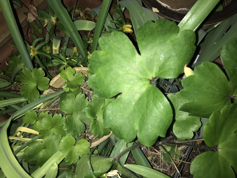 Die marmorierten Blätter gehören zur Pflanze mit der gefüllten Blüte.