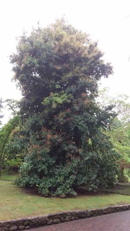 Das kuppelförmige immergrüne Teil rechts der Mitte ist Podocarpus macrophyllus.