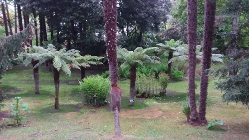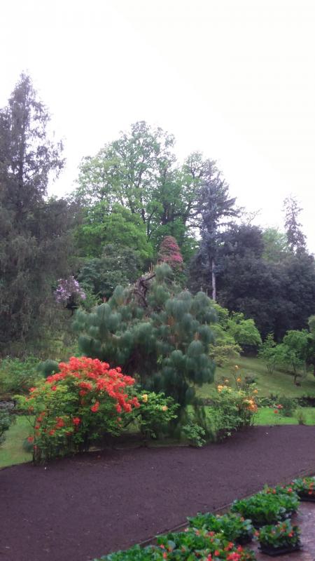 Das kuppelförmige immergrüne Teil rechts der Mitte ist Podocarpus macrophyllus.