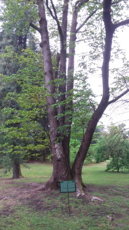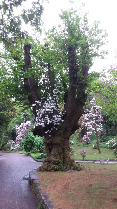 Dieser Rhododendron wächst in einer Gabelung einer Castanea, die laut Angabe auf dem Schild von etwa 1600 n. Chr. stammt.