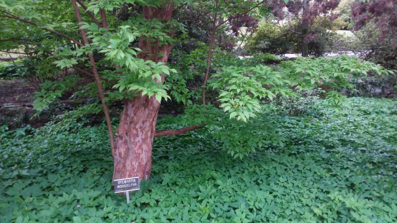 Das kuppelförmige immergrüne Teil rechts der Mitte ist Podocarpus macrophyllus.