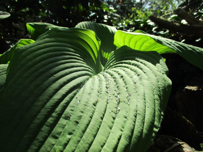 Hier etwas Ruhiges fürs Auge: letzte Nacht fielen überraschenderweise ein paar Tropfen vom Himmel - Hosta 'Jurassic Park' mit Glitzerperlen.