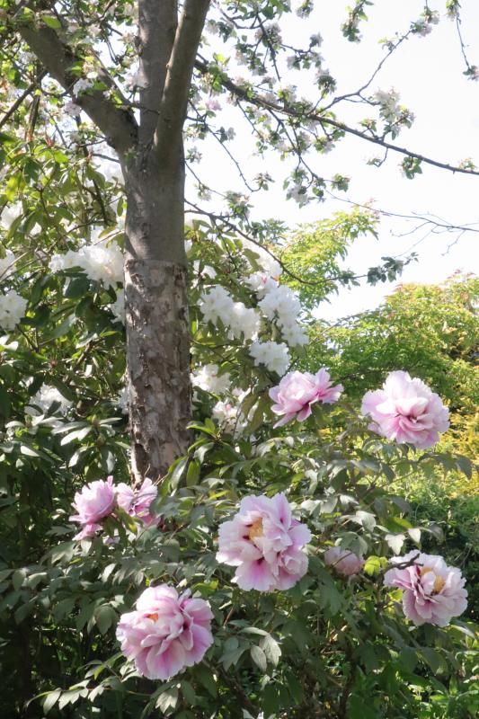 Noch ein Sämling aus der gleichen Kreuzung, der farblich mehr auf den Vater kommt. Im Hintergrund die duftenden Blüten von Rhododendron ´Alena´.