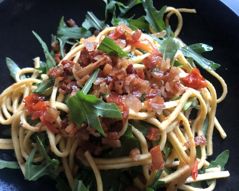 Bei uns gab es frische Pasta mit ausgelassenen Guanciale und Knoblauch, ein paar Datteltomaten, Chili und für mich mit frischem Ruccola dazu.