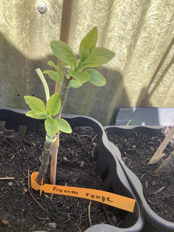 Dieses Frühjahr habe ich die Promm Rouge oder Falsche Althanns veredelt. Bei den Pflaumen lasse ich die beiden oberen Knospen wachsen, bevor ich mich für einen Trieb entscheide, denn oft wächst der zweite besser.
