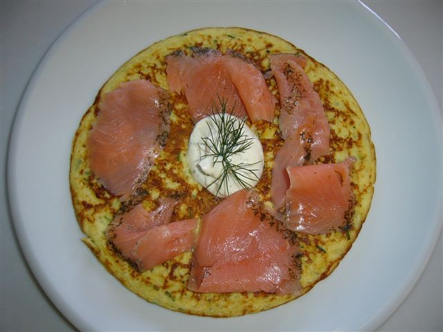 Nach dem Salat gab es:Kartoffelomelette mit Lachs und Meerrettichschaum