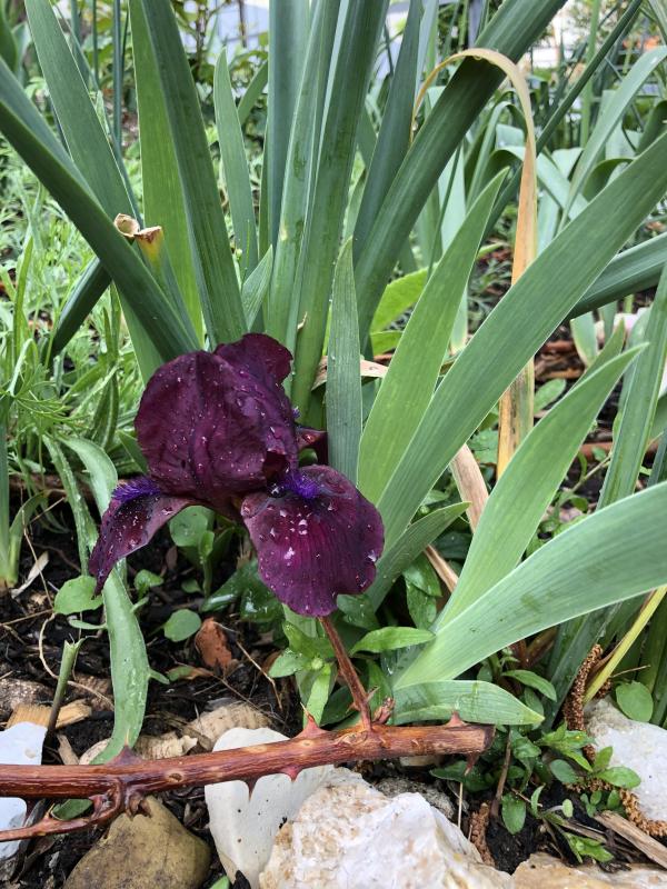 Letzte Jahr, als ich nach Hause kam, stand von unsere Tür eine Schälchen mit Iris Rhizomen und eine Zettel drin: bei uns ist zu viel geworden. Kleine dunkelblaue.