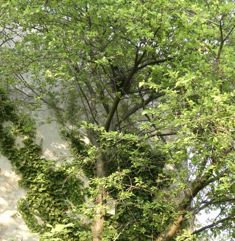 Hier wird die Wildpflaume hinter dem Haus gleich doppelt genutzt. Im Kasten brüten Meisen. Und anderthalb Meter darüber sitzt die Ringeltaube auf ihren Eiern.
