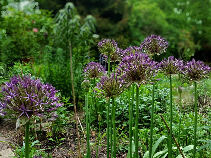 Aufblühender Kugellauch - besitzt ( noch) die Blühhoheit in der Ecke.