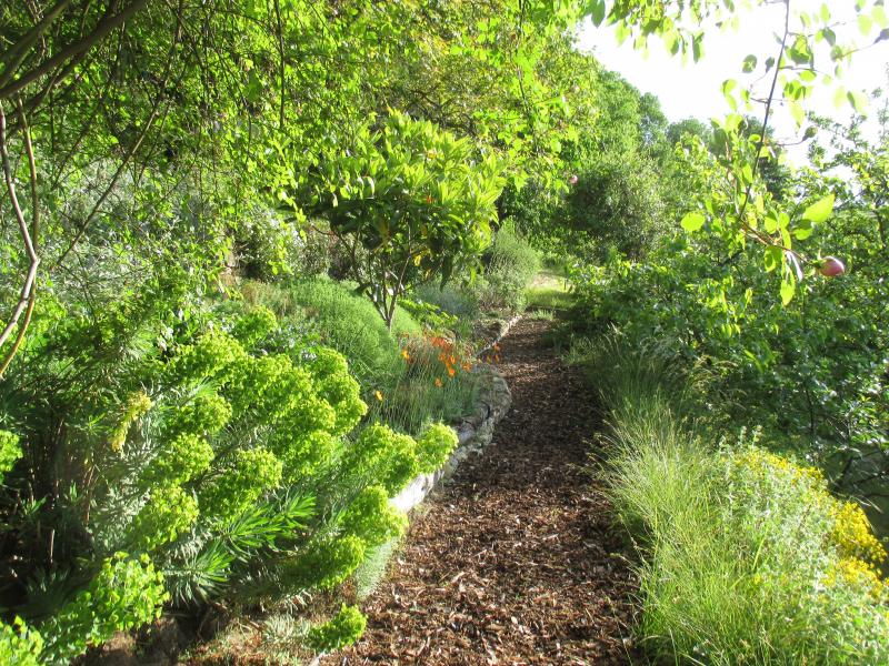 Weiter unten eine mediterrane Terrasse mit Wollmispel.